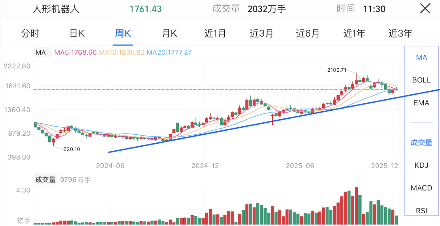 人形机器人 板块在经过前期高位震荡后,目前处于平台整理阶段。市场关注度高,但技术面尚未形成明确的二次启动信号。需要等待明确的政策或事件催化,并配合成交量放大,才能再次打开上行空间;否则将继续维持宽幅震荡。