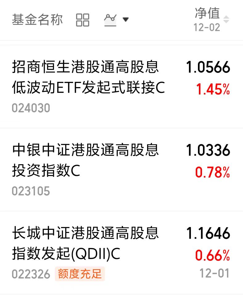 大盘近期波动比较大,各大板块轮动速度很快,红利防御性还不错,港红利昨天涨了不少!$招商恒生港股通高股息低波动ETF发起式联接C(OTCFUND|024030)$昨天涨了1.45%