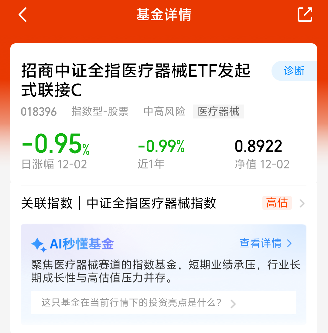 大盘今天震荡调整,医疗器械板块今天小幅回调,近期迈瑞医疗、新产业、惠泰医疗等部分大市值龙头公司有所回调。不过长期来看这个方向发展前景还很大,近期调整我准备分批布局$招商中证全指医疗器械ETF发起式联接C(OTCFUND|018396)$,慢慢积累筹码,耐心等待估值修复了!