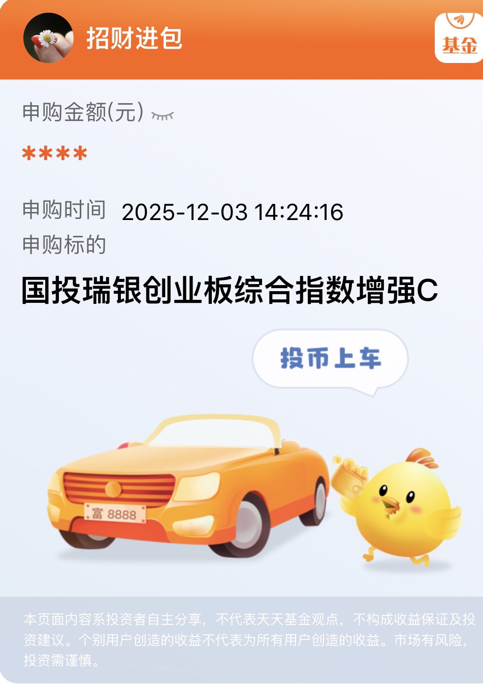 创业指增新发,买一笔试试,他们自己平台买好像更便宜,没有申购费