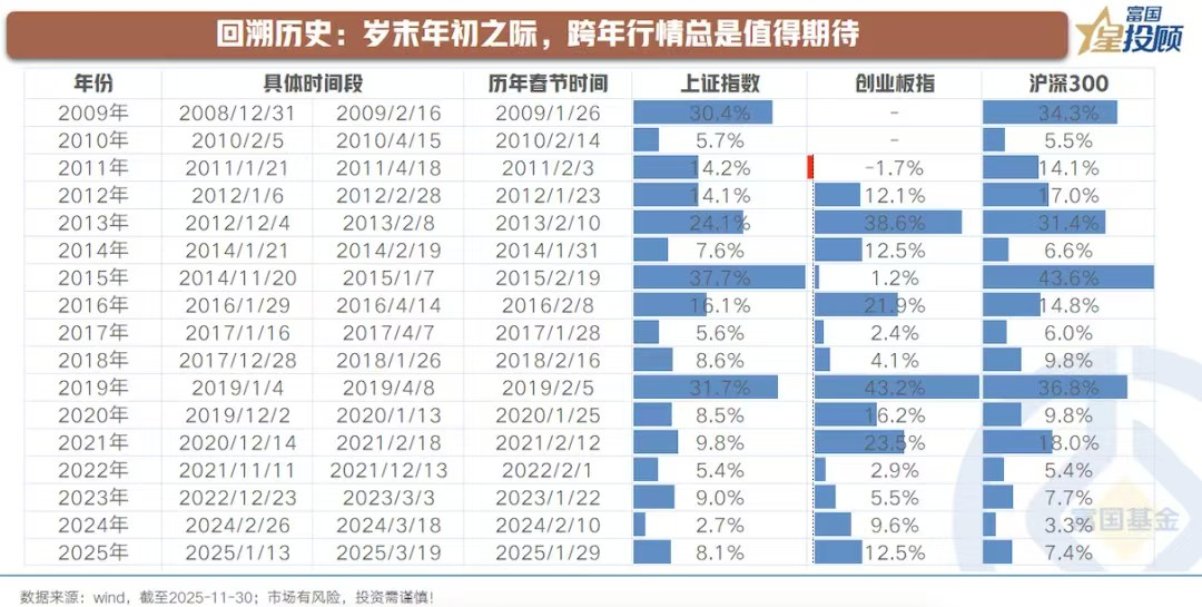 3、跨年行情。近期内外机构对2026年行情展望,可以说喜气洋洋,哈哈咱们也是这样看。其中有机构统计跨年行情,大家看图,历史跨年行情表现不错,其中很重要一个原因,资金年底偏向保守,通常年初又开始干活,所以行情也表现不错,哈哈提前埋伏,近期加速建仓呢。