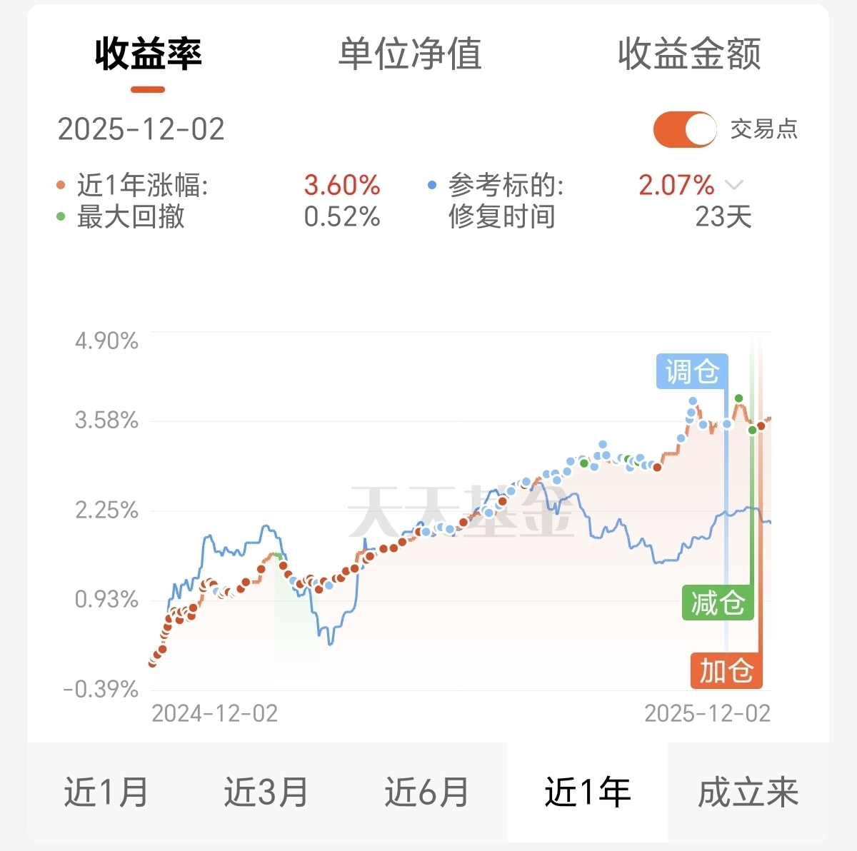 操作方面,今日加仓招商安本增利债券。债基组合-风起天阑近1年涨幅3.6%,参考标的2.07%,最大回撤0.52%,修复时间23天。