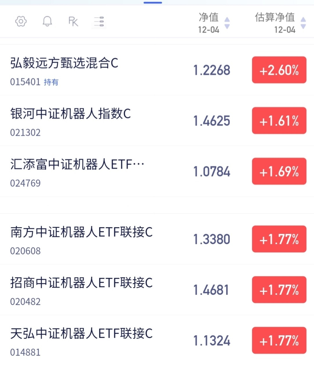 今天权益市场行情其实也并不佳,不过机器人板块有所崛起,可能是最近利好加持比较多吧,我持有的弘毅甄选C当前预估涨了2.60%,在一众机器人中表现非常突出,而且他操作比较灵活一些,目前我就耐心持有,调整就布局。
