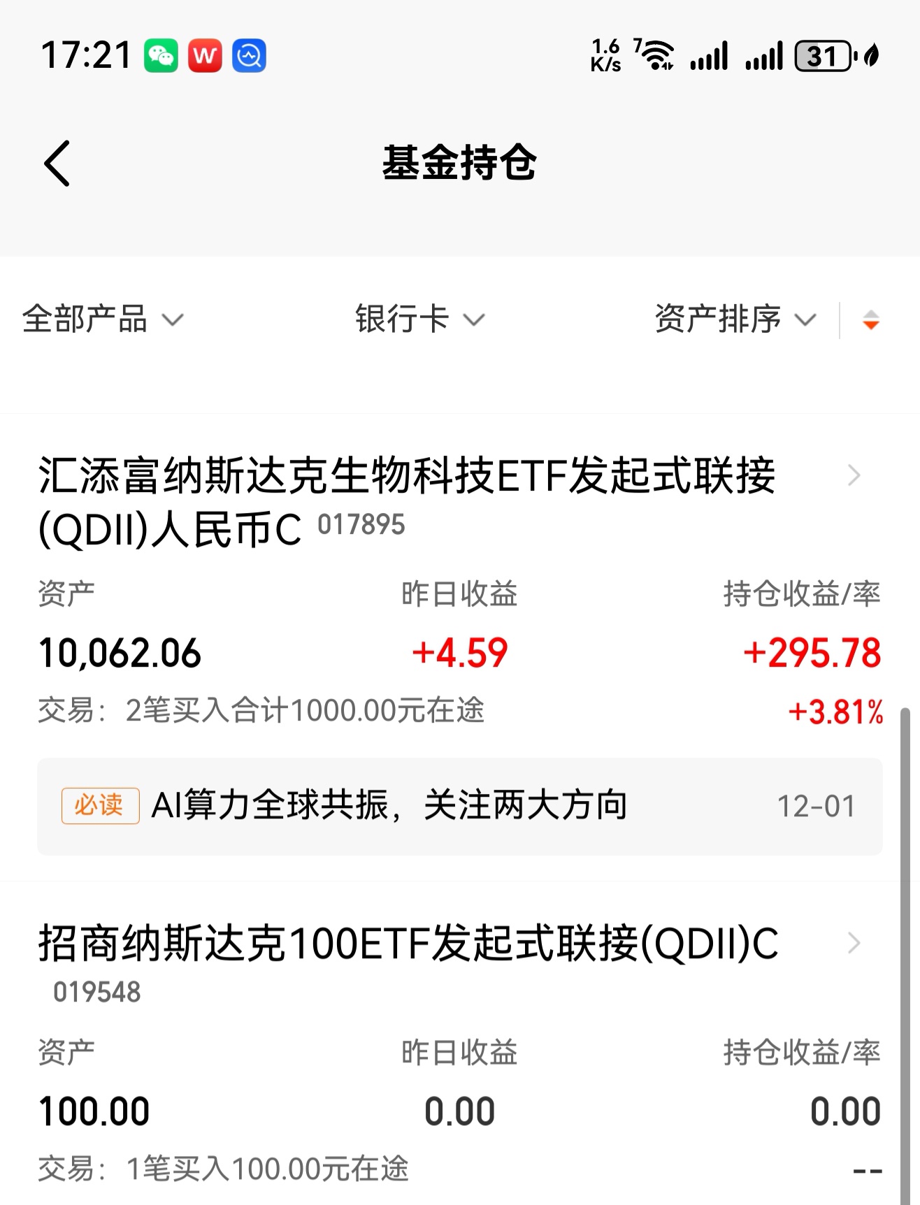 至于目前持有某个美股纳斯达克生物科技指数qdll基金,在今天上午观察就只剩下+0.41%这点收益行了涨幅了。