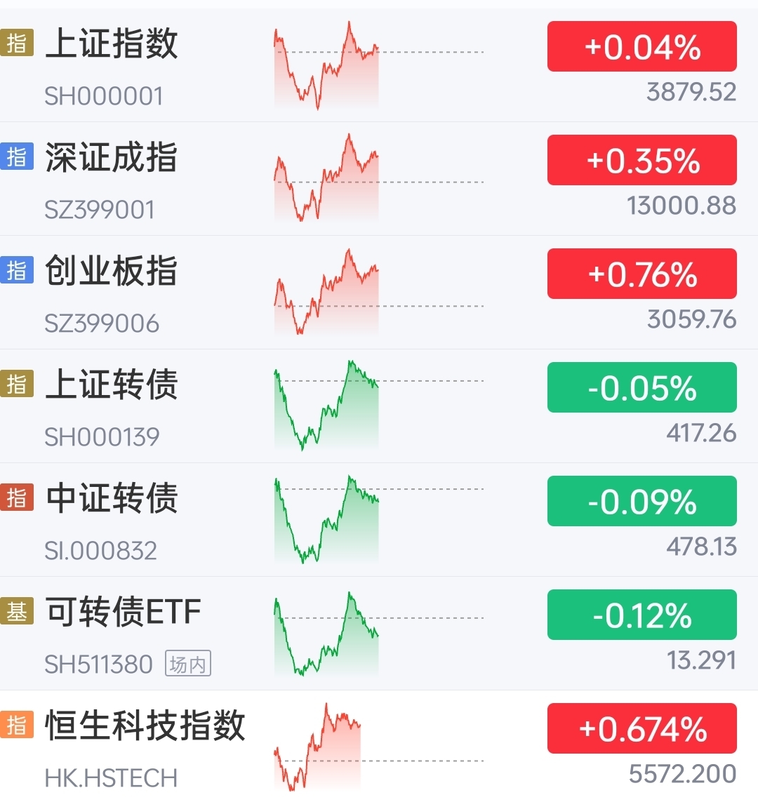 截止到午间收盘隔壁已经拉红:上证指数+0.04%,深证成指+0.35%,创业板指+0.76%,转债目前整体小雨,恒科今天弱反弹,小晴!