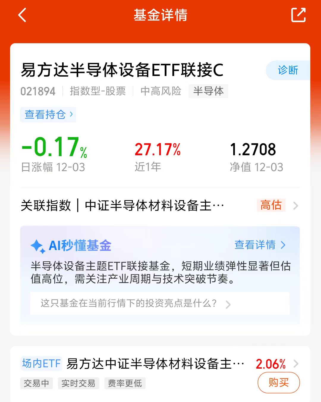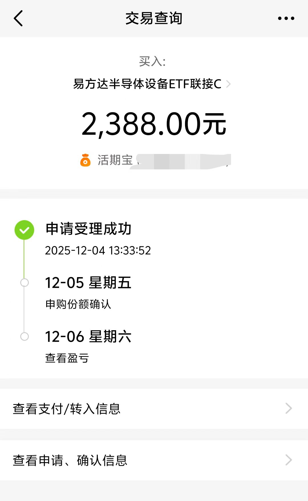 大盘今天回暖上涨,半导体板块今天涨起来了,半导体设备今天领涨,不等了,今天加仓易方达半导体设备ETF联接C2388元,半导体设备板块发展前景还不错,长期看好这个方向,我准备分批布局,慢慢积累筹码,看好之后的行情了!