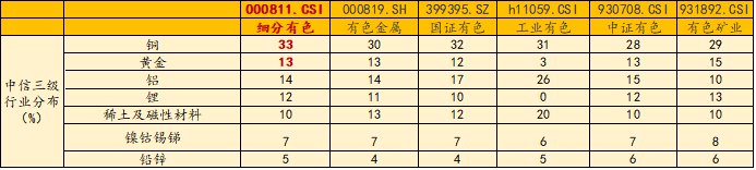 1、“金铜含量”同类领先:中证细分有色金属产业主题指数铜含量达33%,金含量达13%,金铜含量高达46%,同类领先!