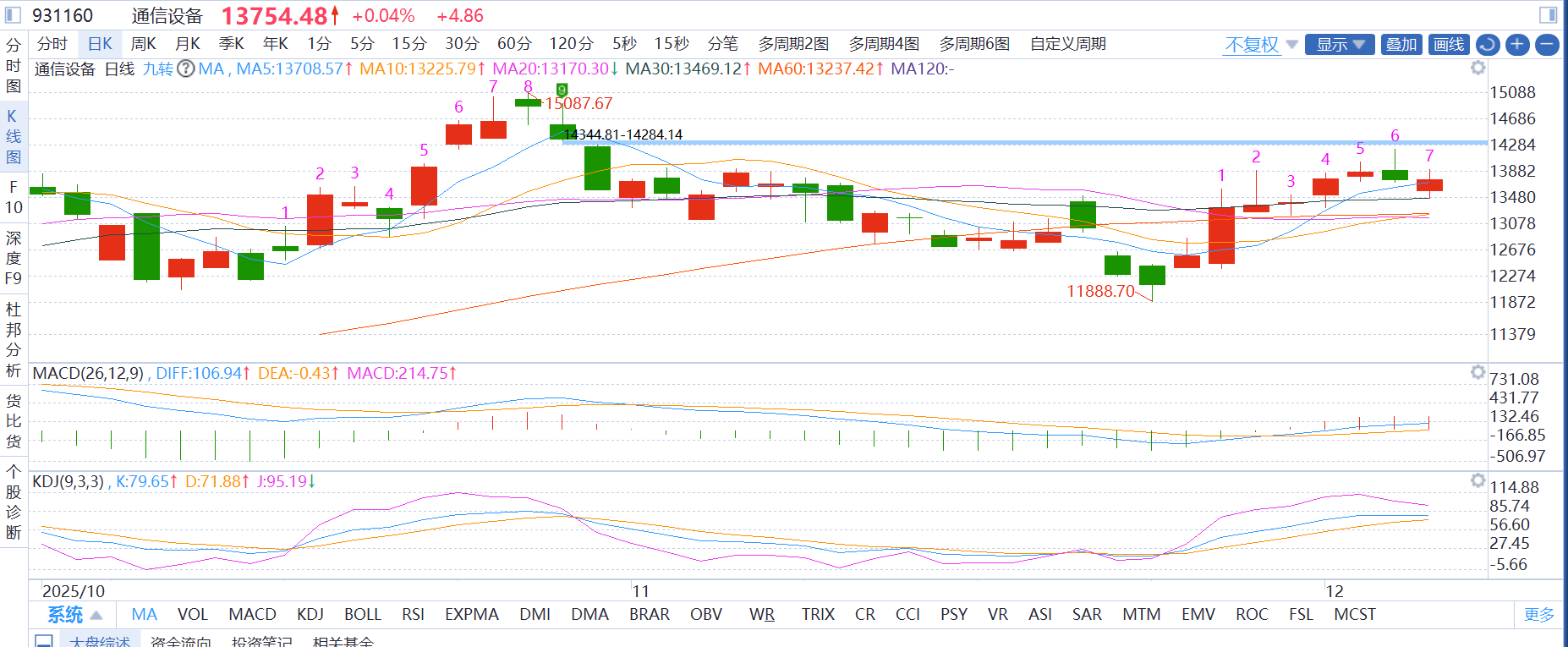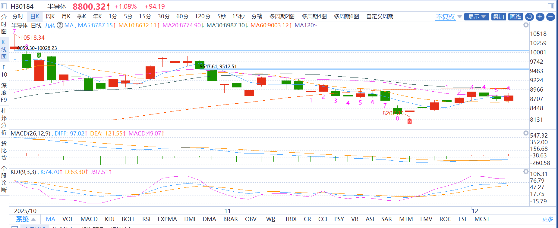半导体:今日震荡走高,半导体设备ETF基金半日收涨2.39%。国产GPU龙头摩尔线程、沐曦股份即将上市,周线看涨逻辑不变,把握国产替代带来的长期机会,麦爸持仓看涨。