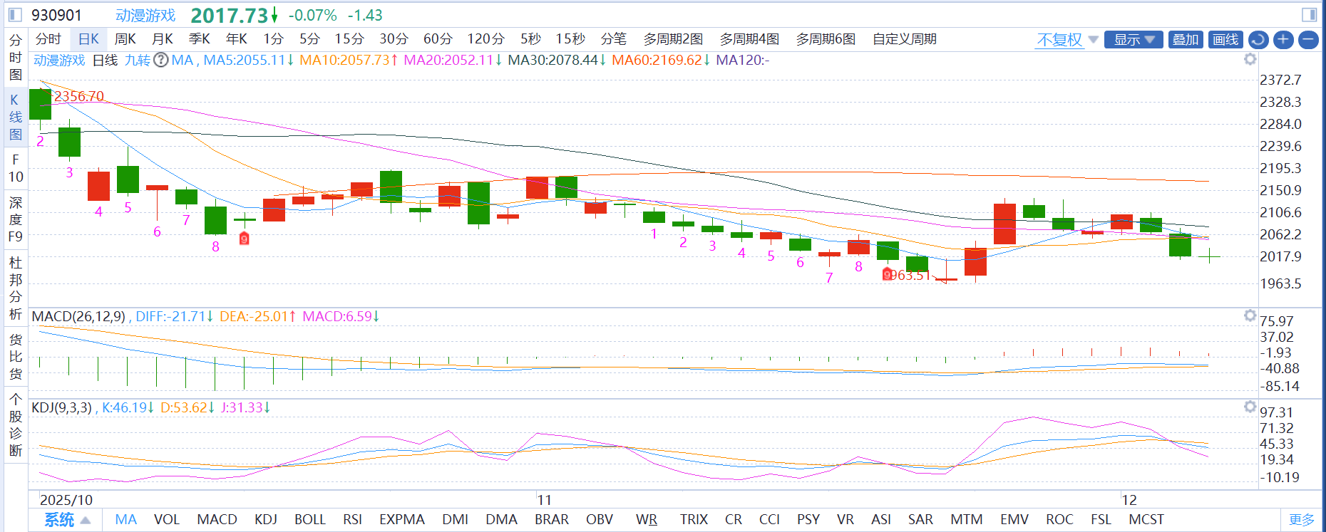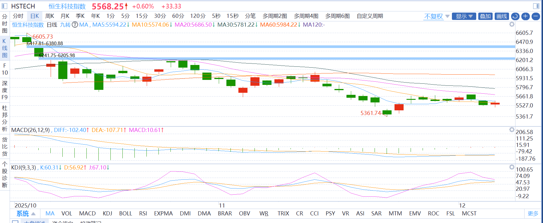 恒生科技:昨天已经低吸,今日就不动了,目前技术面日线MACD金叉红柱,叠加美联储12月降息落地的流动性红利,南向资金还在继续买入,向上趋势不变。麦爸持仓看涨。