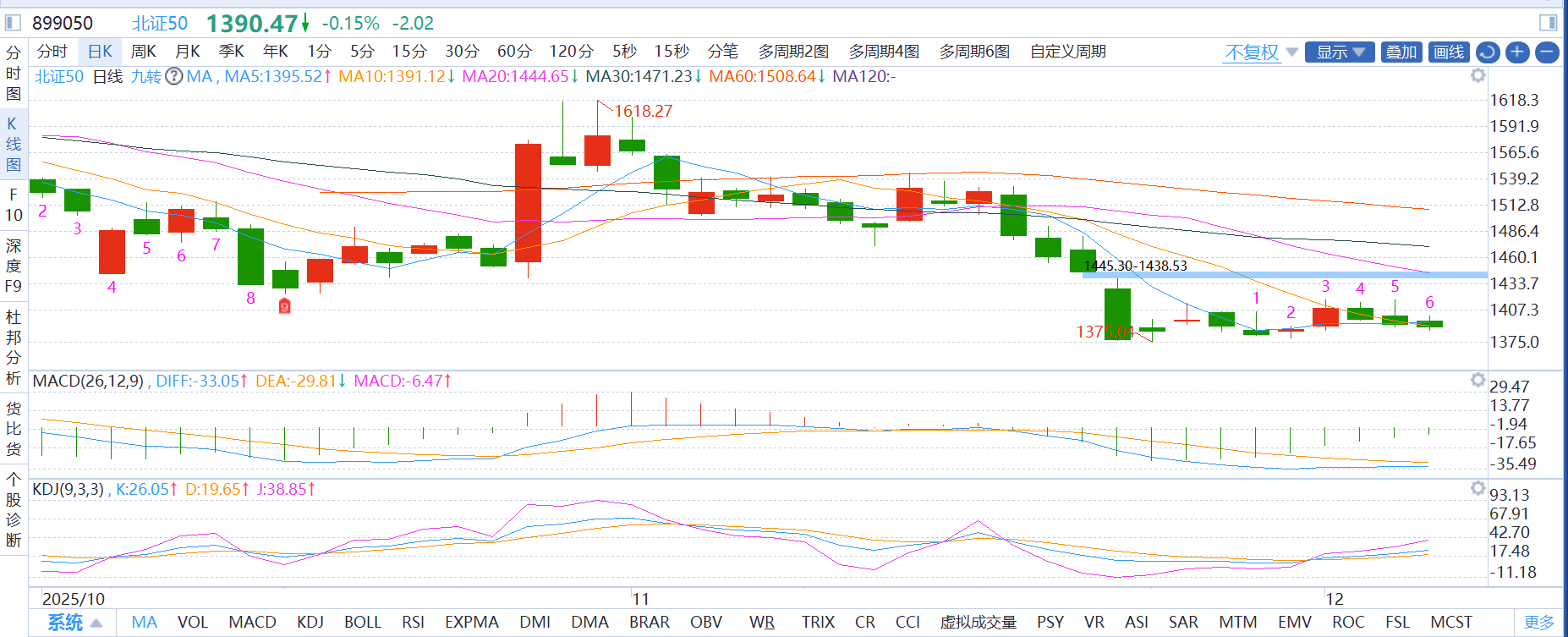 北证50:周线震荡整理,日线级别小幅上涨0.22%,量能一般,目前处于区间震荡格局,没有明确的趋势方向,麦爸选择持仓躺平。