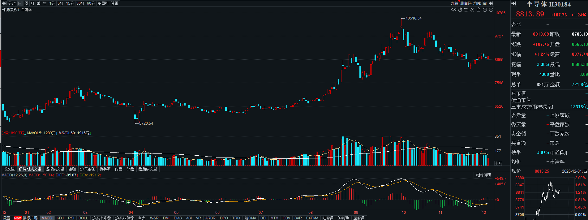 半导体止跌反弹,指数涨超1%,日K线再次站上10日均线支撑,附图MACD金叉向上,短期行情关注60日均线压力位。