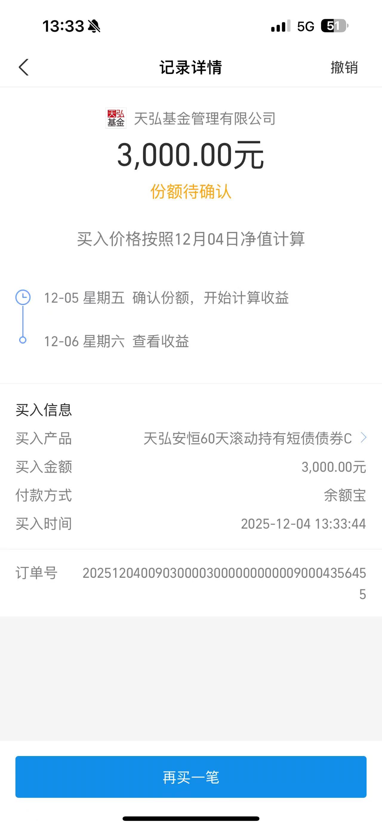 近期A股市场持续调整,3900点已经成为压力,目前美联储12月降息降温,A股市场还没有企稳,资金都很谨慎,此时去无脑买权益市场的分析,风险是大于利润的,还不如多买一点债券,做好投资组合的安全垫。这基金有60天锁定期,避免你天天盯盘操作,适合用闲钱投资,今天先买一笔做个配置,后期有闲钱的话,我会考虑继续加大仓位。