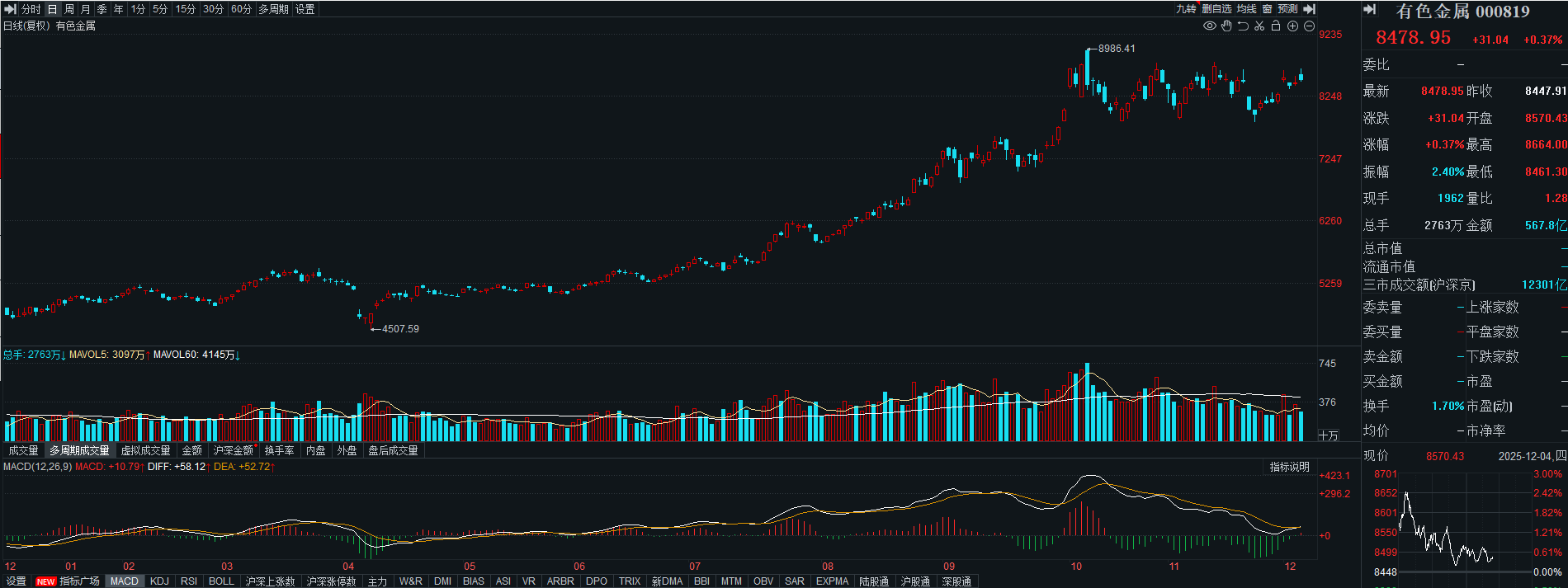 有色金属高位震荡,目前日K线在均线支撑上方,附图MACD金叉冒头,短期行情有继续上攻的趋势,继续格局。
