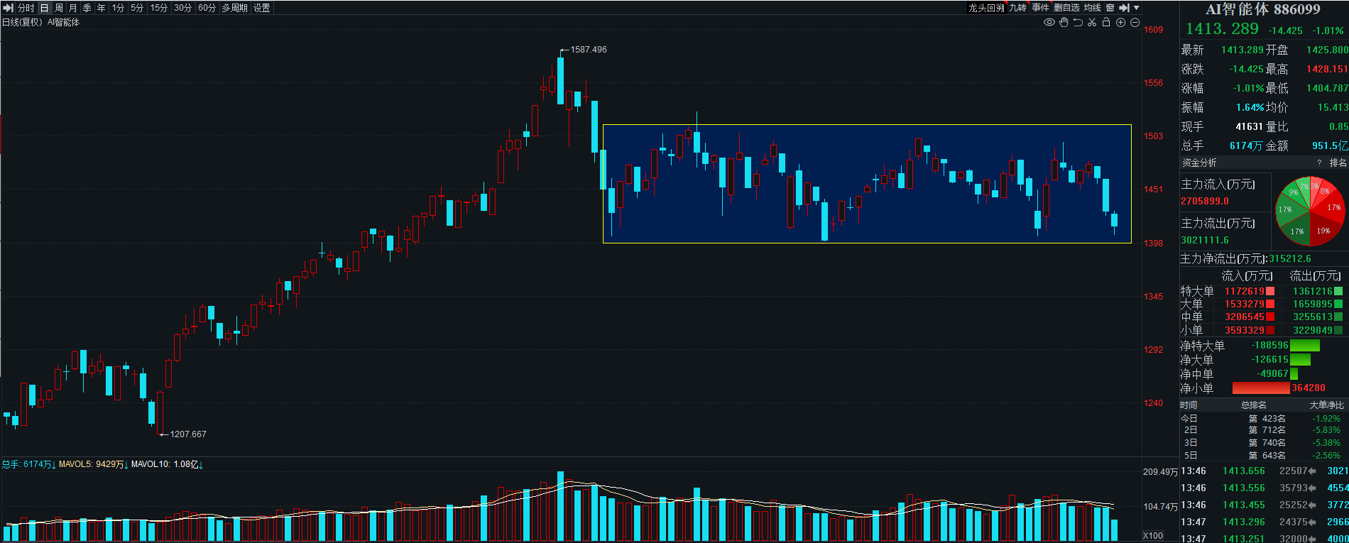 AI智能体震荡走低,指数超跌1%,日K线已经回踩到近期的箱体支撑位置,这里是一个不错的左侧机会,如果尾盘探底回升的话,这个机会就会更加明显。