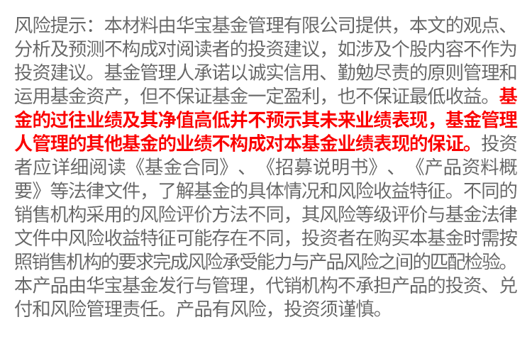 风险提示:本材料由华宝基金管理有限公司提供,本文的观点、分析及预测不构成对阅读者的投资建议,如涉及个股内容不作为投资建议。基金管理人承诺以诚实信用、勤勉尽责的原则管理和运用基金资产,但不保证基金一定盈利,也不保证最低收益。基金的过往业绩及其净值高低并不预示其未来业绩表现,基金管理人管理的其他基金的业绩不构成对本基金业绩表现的保证。投资者应详细阅读《基金合同》、《招募说明书》、《产品资料概要》等法律文件,了解基金的具体情况和风险收益特征。不同的销售机构采用的风险评价方法不同,其风险等级评价与基金法律文件中风险收益特征可能存在不同,投资者在购买本基金时需按照销售机构的要求完成风险承受能力与产品风险之间的匹配检验。市场有风险,投资需谨慎。