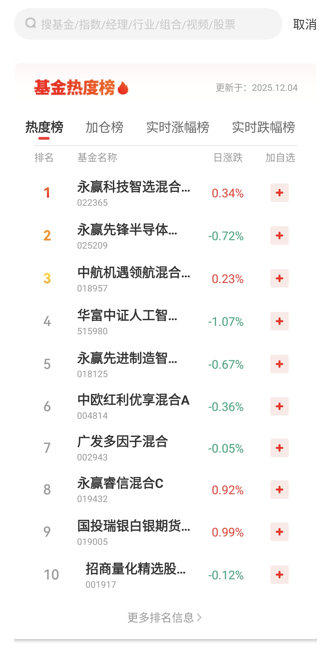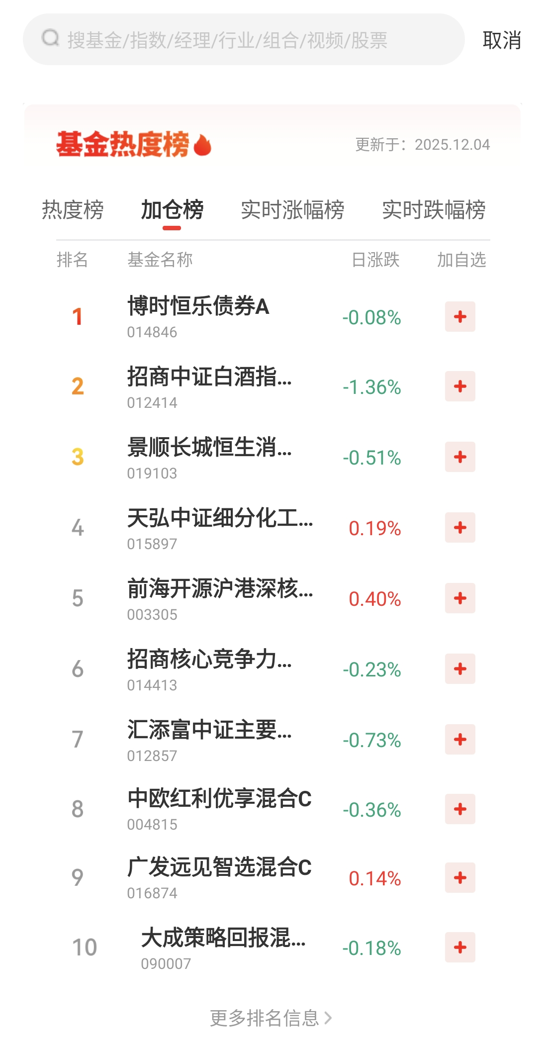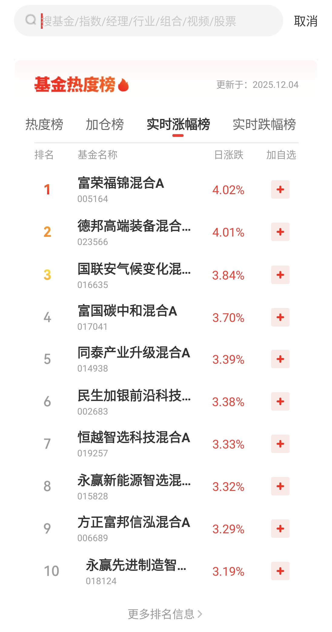 12月4日基金热度榜,加仓榜,实时涨跌幅榜