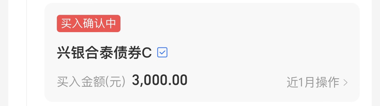 $兴银合泰债券C$ :小王今日红包3000-0.54上车,这是一只弹性较大的纯债基金,因为最近债市又开始经历的回调,所以导致期目前又在低位,但是我觉得回调过后也意味着回暖的到来,我也要开始逢低布局,期待早日回暖;从最新的第三次继续持仓来看,信用债占比109.16%,利率债占比11.66%,只要行情回暖,该基金的回撤修复能力也比较强,所以比起追涨我更喜欢低吸,趁着目前处于低位,我觉得反而也是个不错的机会,拉开长期收益来看,近一年的收益也达到了2.44%,也是妥妥跑赢的银行定期存款的两至三倍,所以我就准备继续定投上车3000,期待后续回暖吃肉啦