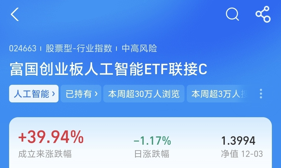 $富国创业板人工智能ETF发起式联接C$ 就是跟踪该指数,95%资产投向目标ETE,紧密捕捉算力基建与AI应用红利。成立以来涨幅有39.94%,长期收益亮眼,且C类份额0申购费、年销售服务费仅0.2%,成本优。