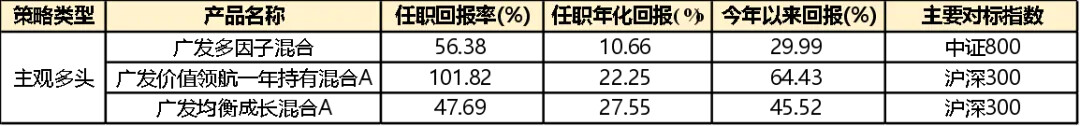 除了广发多因子,偏向主观的基金还有广发价值领航一年持有混合A(014317)与广发均衡成长A(019876),任职年化回报均达到20%以上。$广发多因子混合(OTCFUND|002943)$$广发价值领航一年持有混合A(OTCFUND|014317)$$广发均衡成长混合C(OTCFUND|019877)$