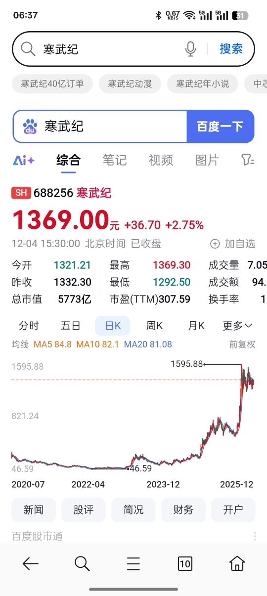 23年4月13号的时候,我感慨AI的强大,当时没有买股票的概念,结果AI人工智能第一企业:寒武纪(股民称其为寒王),从46.59元一路爆冲,涨到1369元,翻了将近30倍。