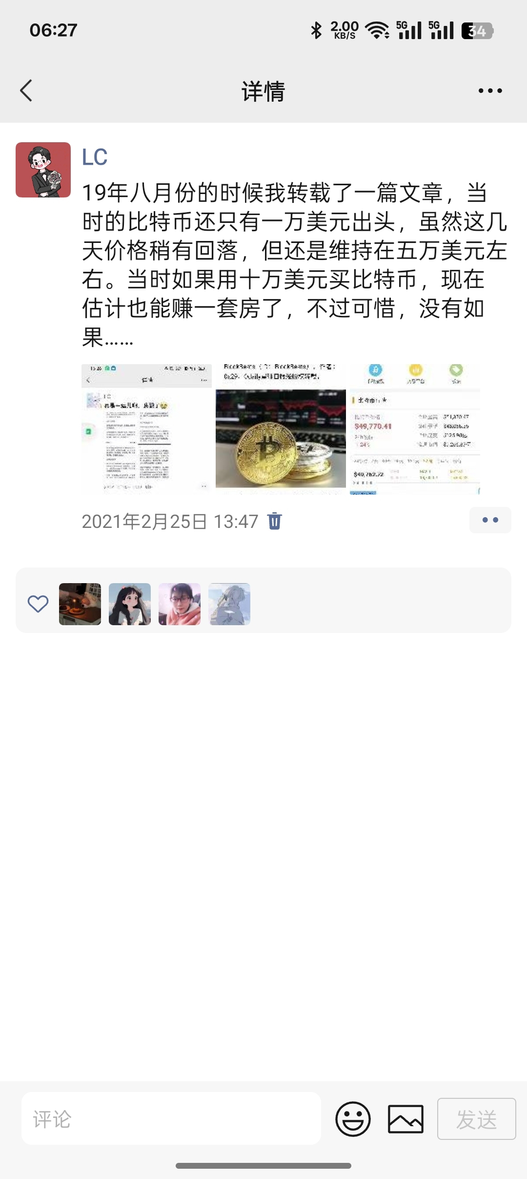 2021年2月25日的时候,我在朋友圈感慨,比特币冲到了5万美元一枚了,当时后悔的拍断大腿。