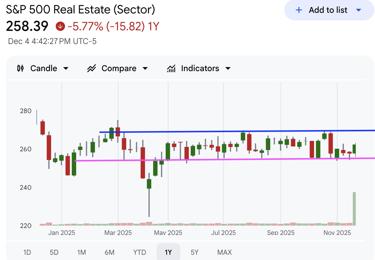 标普房地产板块:房地产板块的走势相对胶着,维持在箱体横盘整理,方向尚不明朗。该板块目前处于等待明确市场信号的阶段,需观察其能否成功突破现有箱体区间的限制。