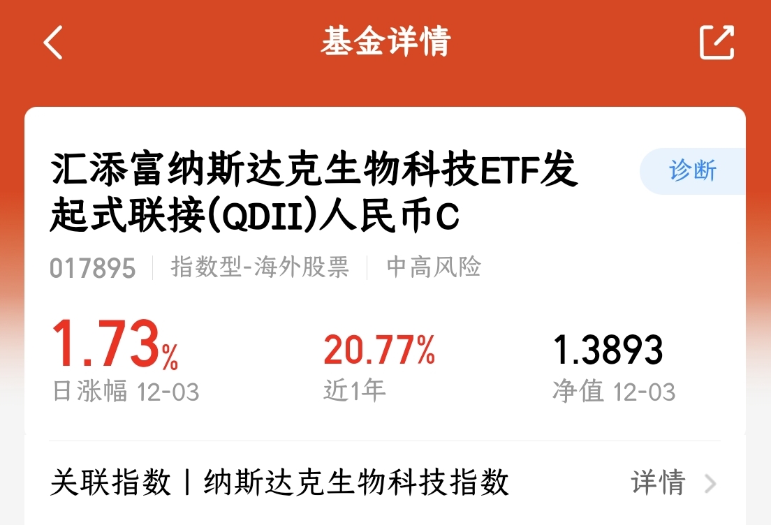 我近期关注到$汇添富纳斯达克生物科技ETF发起式联接(QDII)人民币C(OTCFUND|017895)$基金,该产品跟踪纳斯达克生物科技指数,聚焦制药、生物科技等美股医药龙头。全球老龄化趋势加速,医疗健康需求持续增长,相关企业基本面强劲。基金业绩表现突出,近三个月上涨18.26%,近半年涨幅达31.96%,大幅跑赢纳斯达克指数。