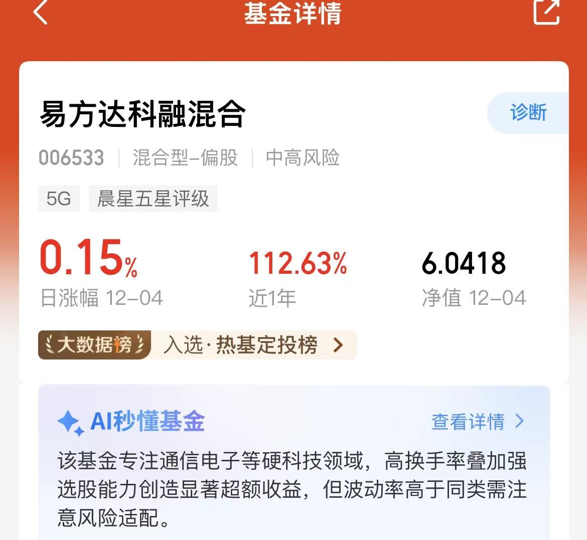今天A股低开高走,三大指数都翻红了,盘面还是不错的,科技板块也开始慢慢回暖了,易方达科融混合摒弃单一赛道押注,科技+新能源的组合有效对冲内卷风险,这是通过A+H投资灵活捕捉跨市场机遇,重仓港股科技龙头与A股新能源核心标的,年化收益率112.63%,业绩出色,我长期看好未来趋势。#机构:看好“春季行情”提前开启# #12月基金投资策略#$永赢科技智选混合发起C(OTCFUND|022365)$