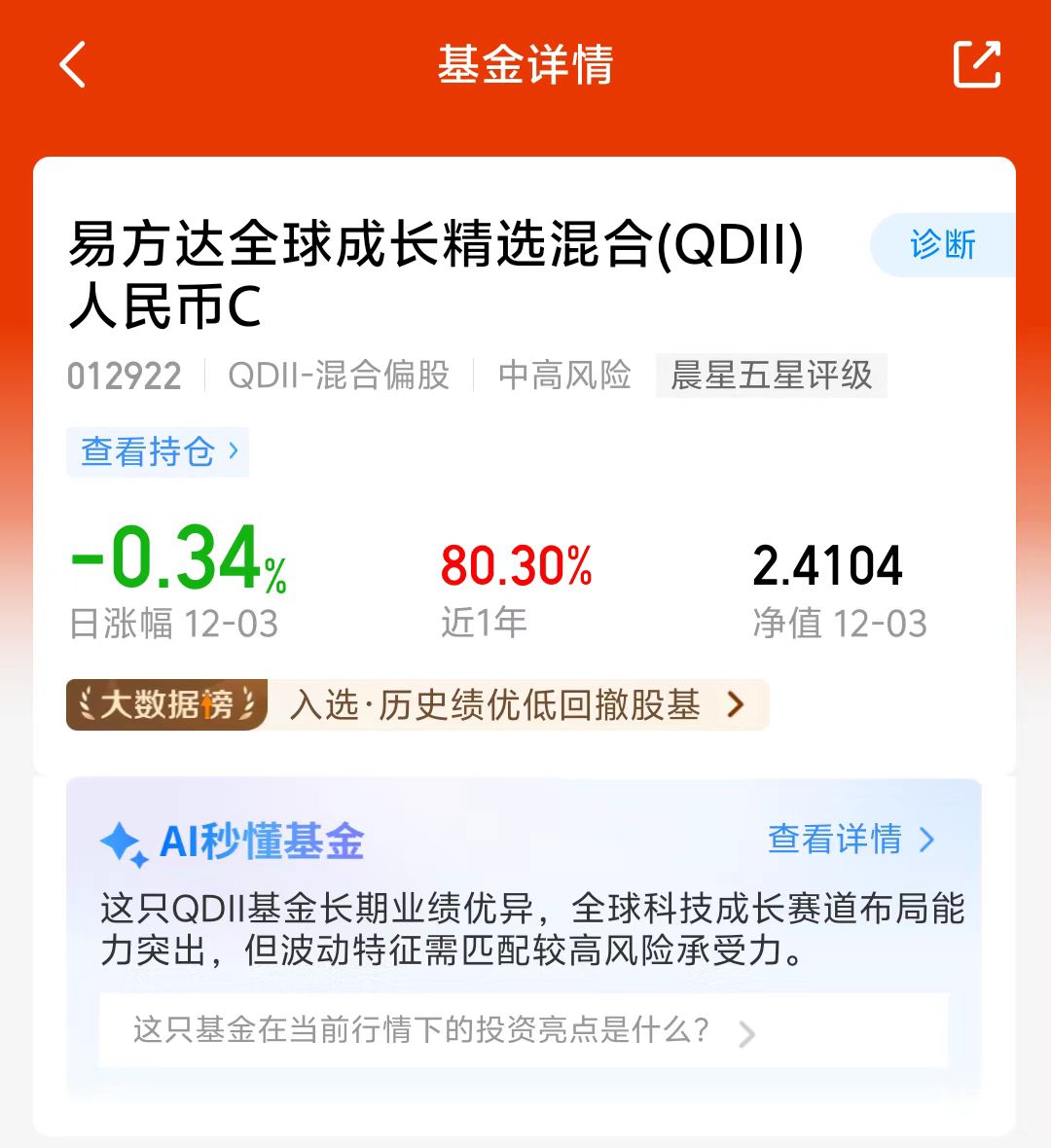 大盘今天涨起来了,盘中波动比较大,午后三大指数拉升翻红,美股昨夜小幅上涨,近期全球市场轮动速度很快,单一市场风险比较大,易方达全球成长精选混合C持仓可投全球科技板块,灵活把握美股、港股和A股科技成长机遇,近一年涨了80.30%,长期看好这个方向,我准备分批布局了!