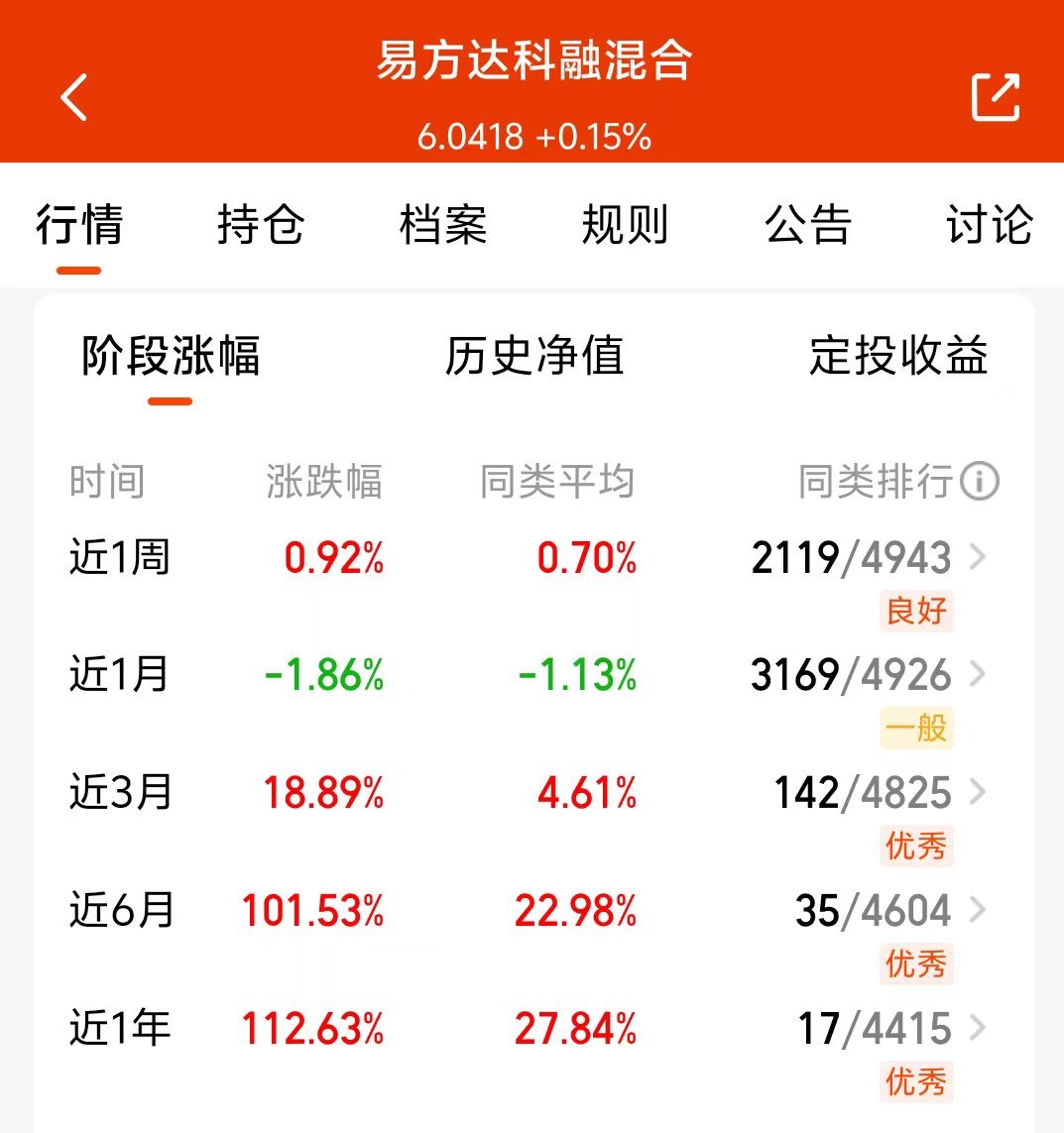 大盘今天表现还不错,午后拉升翻红,近期市场波动比较大,轮动速度太快了,易方达科融混合持仓有科技、新能源和军工等板块,轮动配置,近六个月涨了101.53%,业绩还不错,自己选赛道容易踏空,我还是相信经理调仓能力,我打算分批上车了!