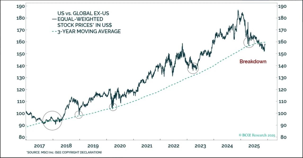 下图,这个图的视角很有意思,是用的「美股等权重指数」,除以,「剔除美股后的全球股市等权重指数」,两者的比值走势图。