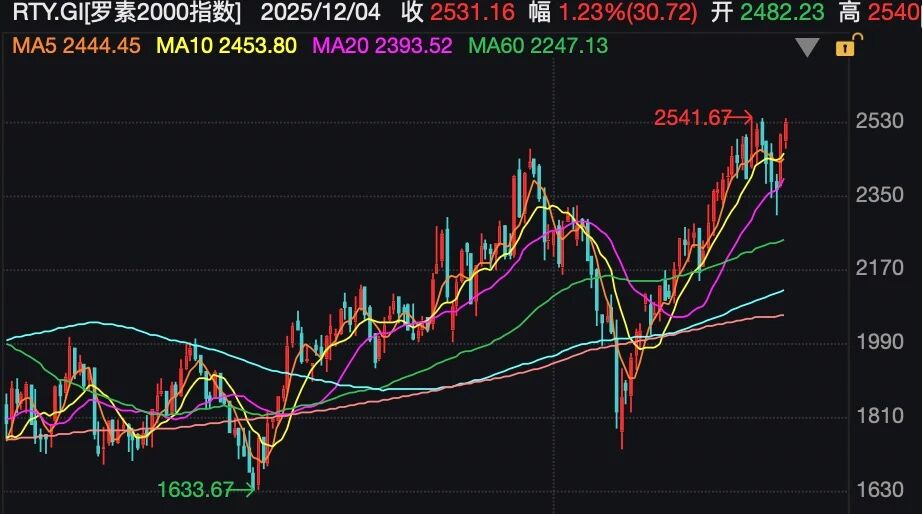 从点位来看,下图,小盘股昨晚收盘价为2531点,而此前历史最高点是2541点,此前的收盘价最高点则为2513点,因此,事实上,小盘股已经创下了收盘价的历史新高,这是降息预期支撑股市的最有力证据之一了。