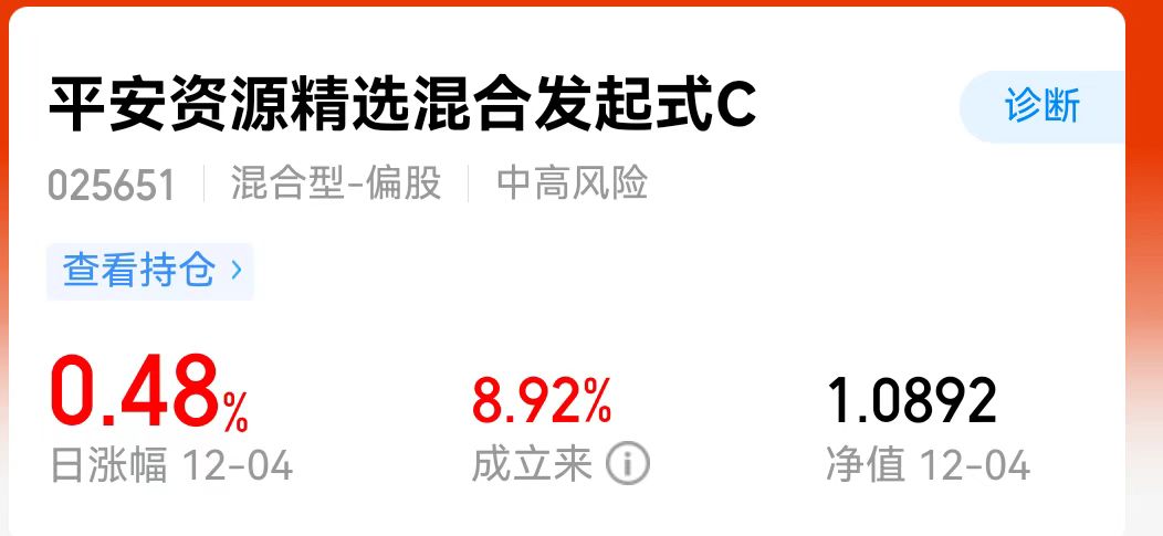 周期:麦爸昨天追加的$平安资源精选混合发起式C(OTCFUND|025651)$,不得不赞一下,虽然是收益0.48%,但要知道昨天很多有色和资源股都收跌,这只依然逆势领涨,加今天估计要连涨3天,今天估值预计也会是最高的;