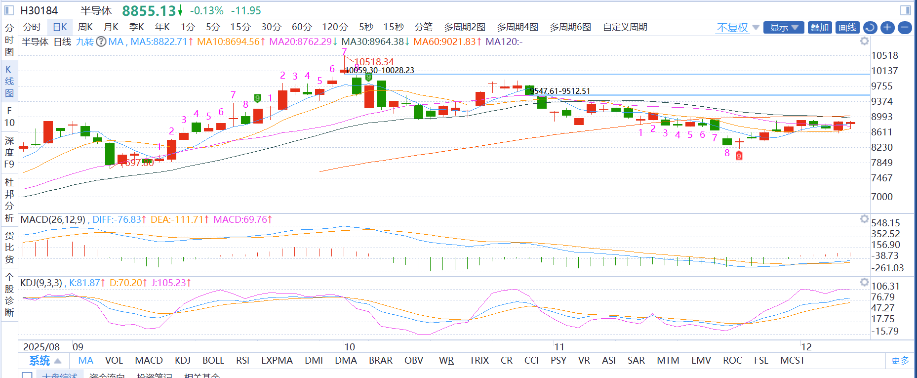 电池:日线级别探底回升,量能温和,目前在均线附近获得支撑,MCD绿柱子持续缩短,KDJ指标有企稳迹象,周线处于震荡上行趋势,看涨趋势明确向上。麦爸选择持仓待涨。