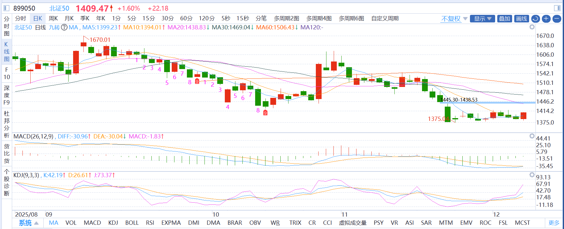 北证50:指数微涨0.47%,但个股分化严重,新股摩尔线程吸血效应明显,但技术面昨日现十字星,今日若收阳线确认,短期上涨趋势有望到了,麦爸选择不动,持仓躺平。