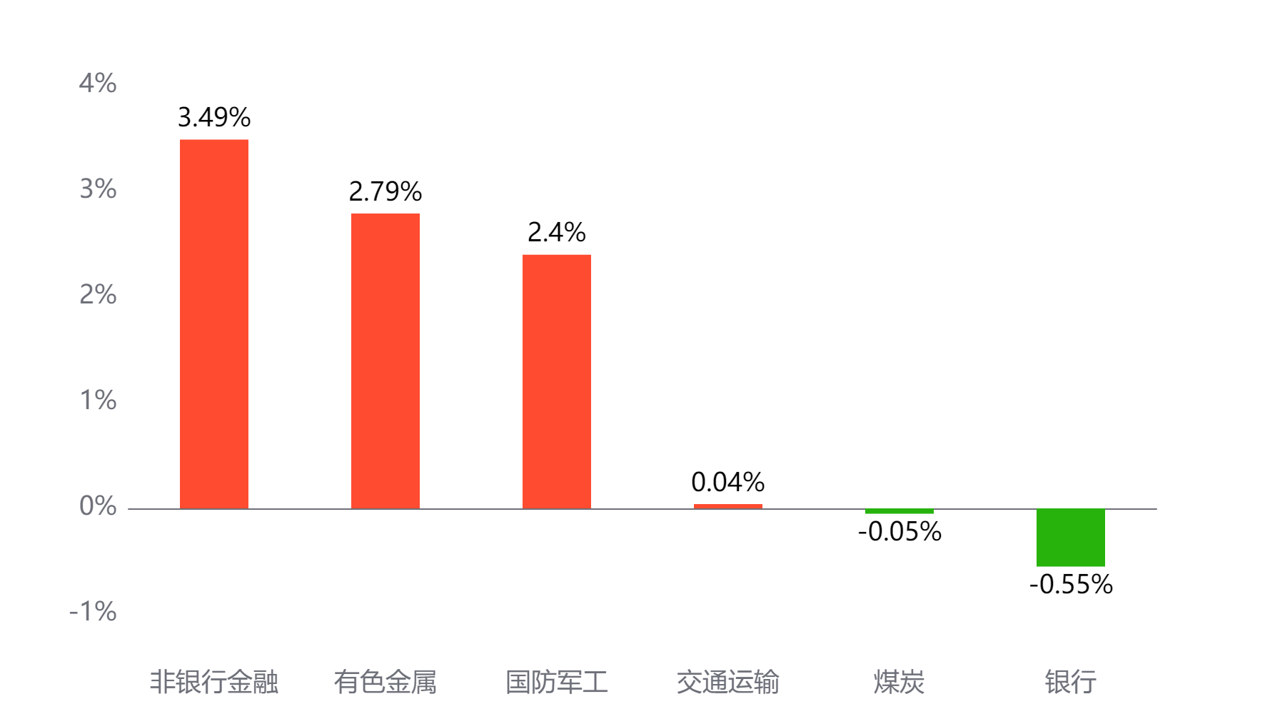 今天表现最好的行业板块依次为非银行金融、有色金属、国防军工,表现最差的依次为交通运输、煤炭、银行。