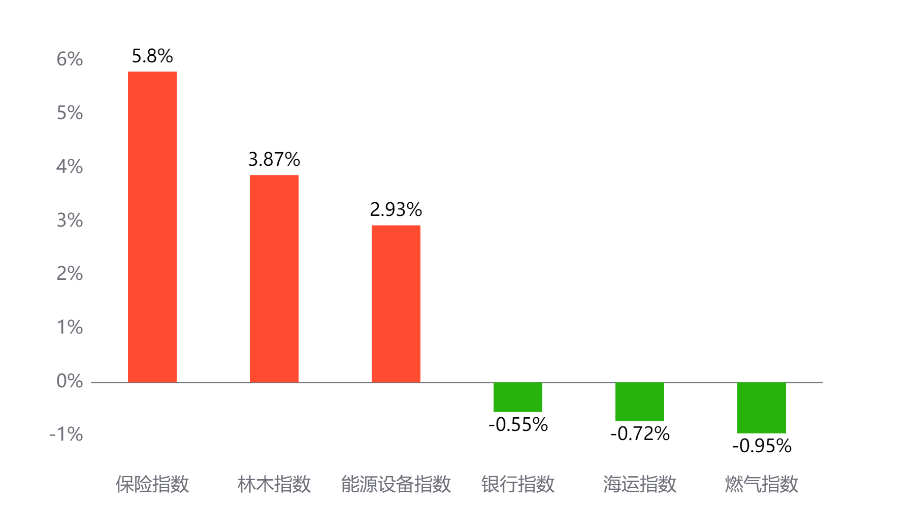 今天表现最好的主题概念依次为保险、林木、能源设备,表现最差的依次为银行、海运、燃气。