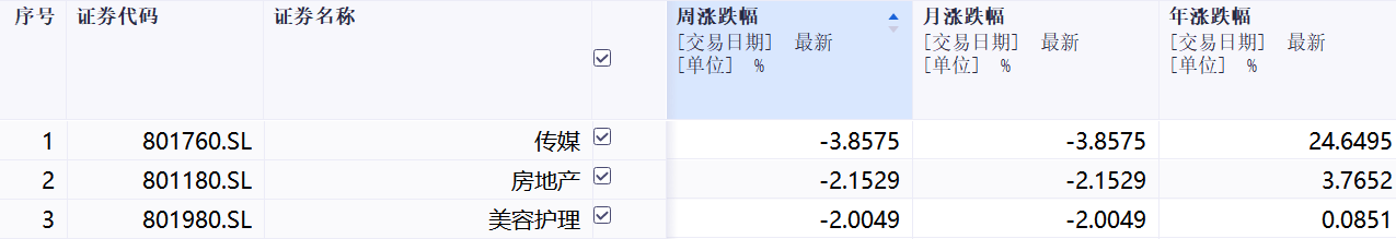 本周跌幅前三行业: