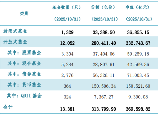 10月公募基金市场数据:截至 2025 年 10 月底,机构管理的公募基金资产净值合计36.96 万亿元。