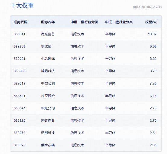 截至12月3日,科创芯片指数的前十大权重股见下: