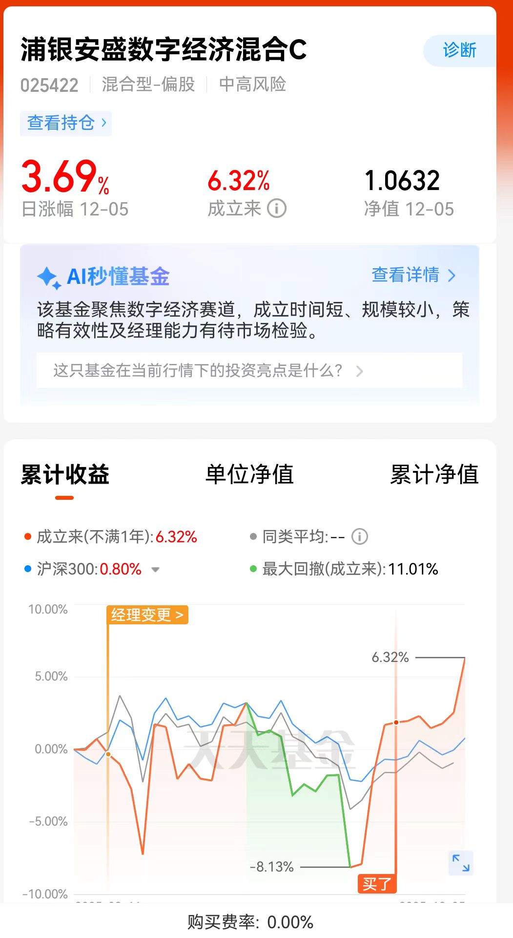 各位兄弟姐妹们晚上好呀,实在有点惊喜,白天麦爸刚加了$浦银安盛数字经济混合C(OTCFUND|025422)$,今晚更新净值大涨3.69%,很多CPO概念的基今天都只涨了一个点左右,麦爸最开始关注到浦银就是因为感受到了它时不时就能给个大爆发一下,因为是新基,看不到持仓反而还时不时能收获惊喜,不过从它的净值表现来看,CPO+PCB的成分是确定的,期待下周继续飞了!