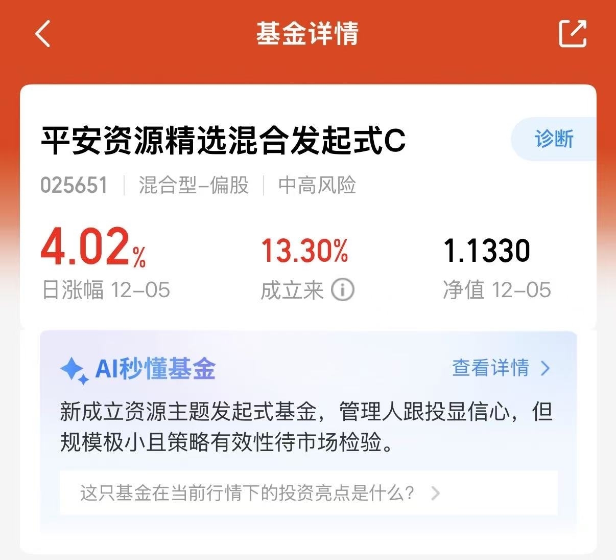 四季度最强新基,一个月涨幅10个点,平安资源精选太牛啦!今日涨幅+4.02%。