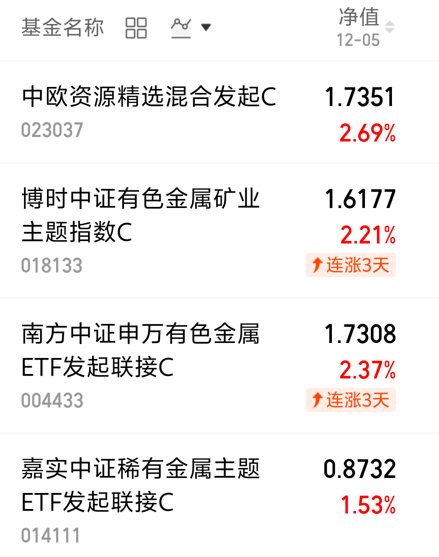 $南方中证申万有色金属ETF发起联接C(OTCFUND|004433)$今天涨了2.37%