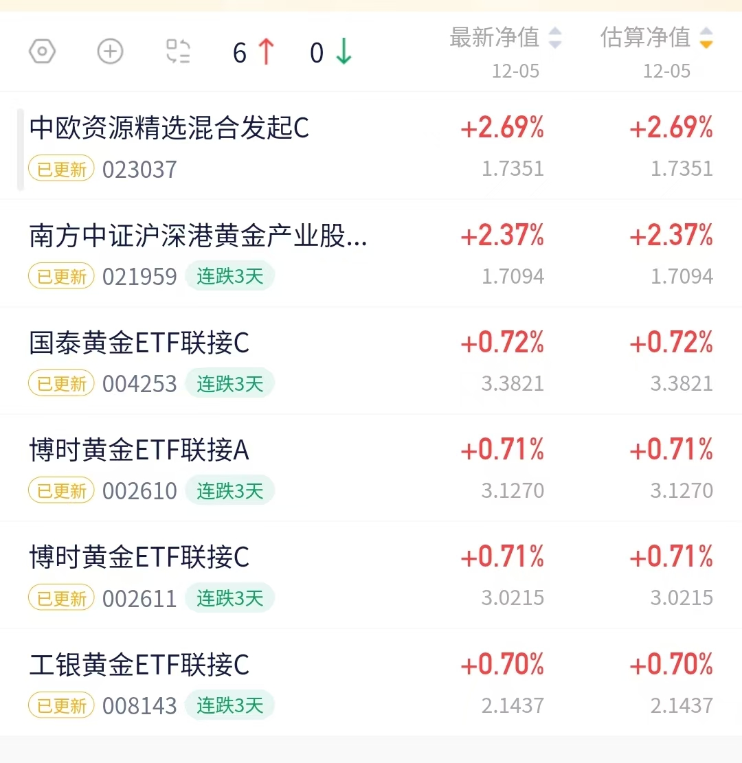$南方中证沪深港黄金产业股票指数发起C(OTCFUND|021959)$收涨2.37%。