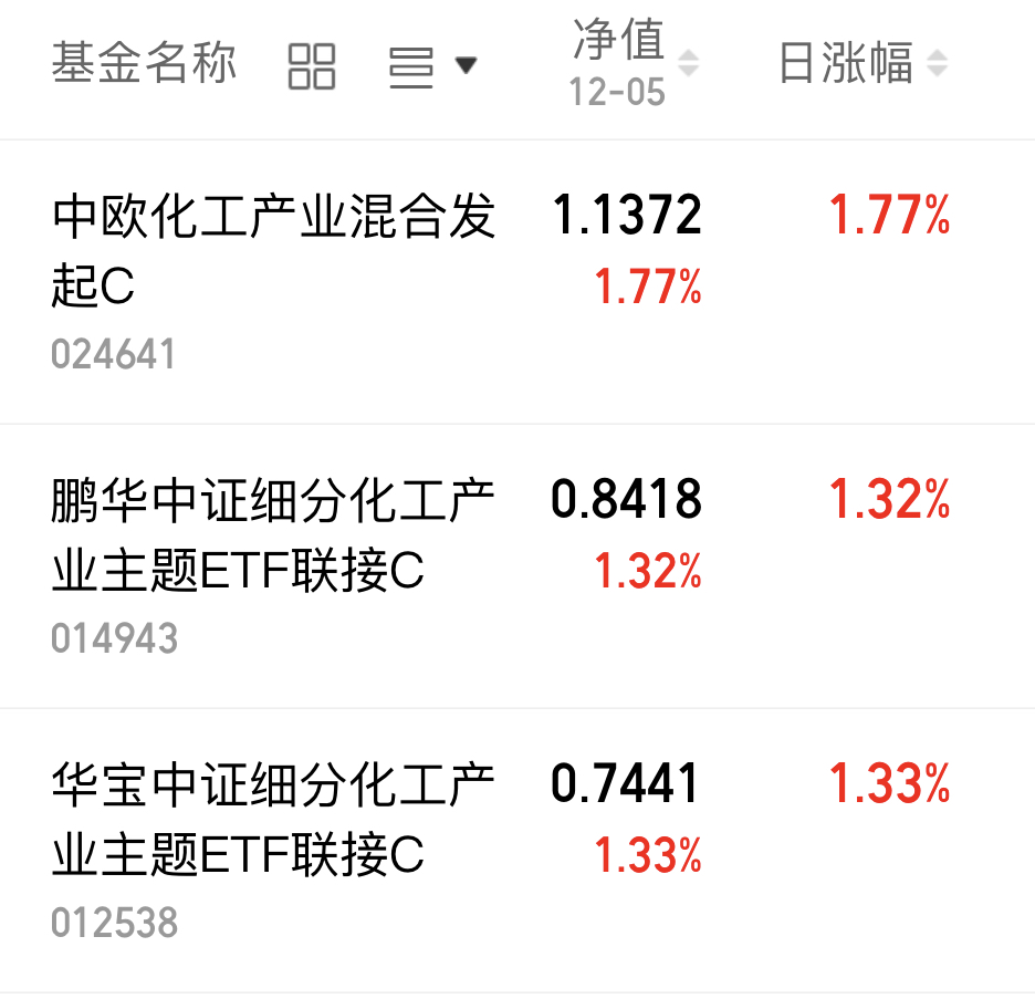 今天大盘回暖,三大指数集体上涨,市场情绪回暖。化工板块顺势上涨,政策红利加持叠加下游需求释放,行业景气度回升,板块估值修复明显,一起来看净值情况。