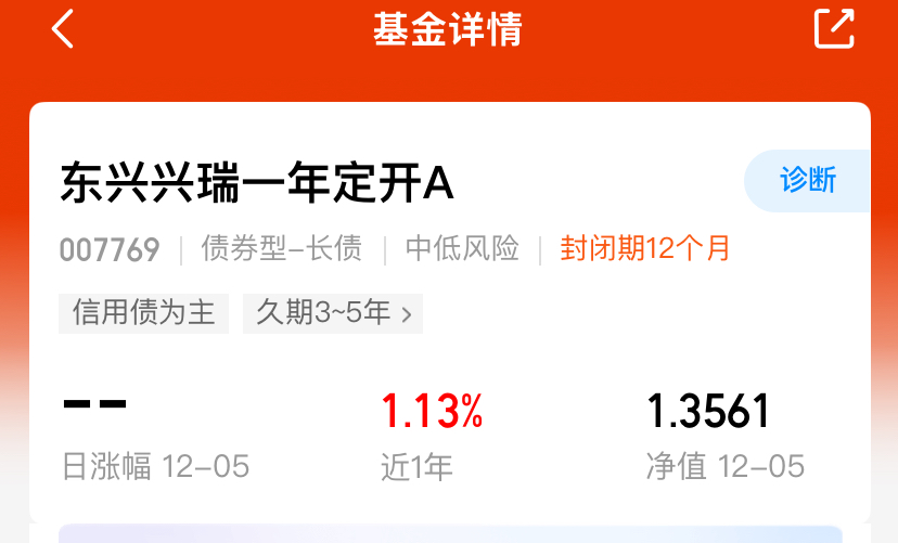 今天债券市场这边,整体还不错,双债晴天为主,其中$东兴兴瑞一年定开A(OTCFUND|007769)$作为定开基,主投信用债,整体业绩比较稳健,近一年收蛋113个,持有起来省心又省力,平时还抗跌,能够在年末震荡的情况获取稳健的收益!$广发汇利一年定期开放债券(OTCFUND|008296)$$建信荣禧一年定期开放债券(OTCFUND|007699)$#牛市旗手猛飙:短期反弹or趋势反转?#