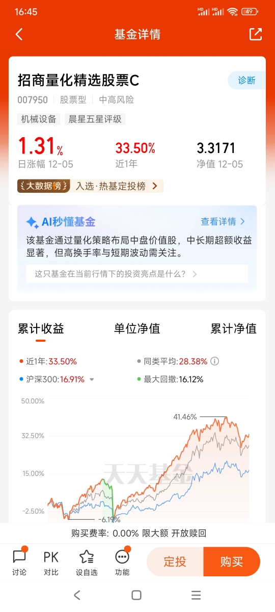 对于普通投资者而言,选择优质量化基金需关注三个维度:一是策略迭代能力,优秀产品每年更新超百次;二是风控颗粒度,顶级产品最大回撤控制在5%以内;三是规模容量,中型规模(50-100亿)既能承载策略又避免体量制约。当前市场环境下,与其在板块轮动中疲于奔命,不如借道量化基金让专业系统代劳,享受科技赋予的“躺赢”红利。毕竟,投资的本质是认知变现,而量化正在重新定义这个时代的认知边界。@招商基金