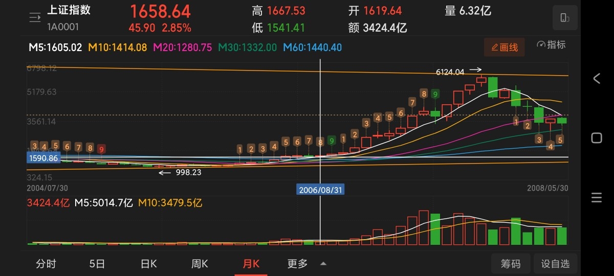 市的月线图。第一次大牛市是在2006年8月开始