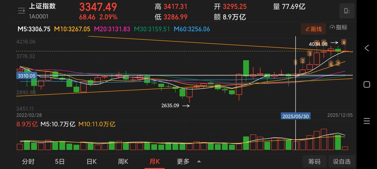 阳。最高在3450左右,然后也同样在月线级别收