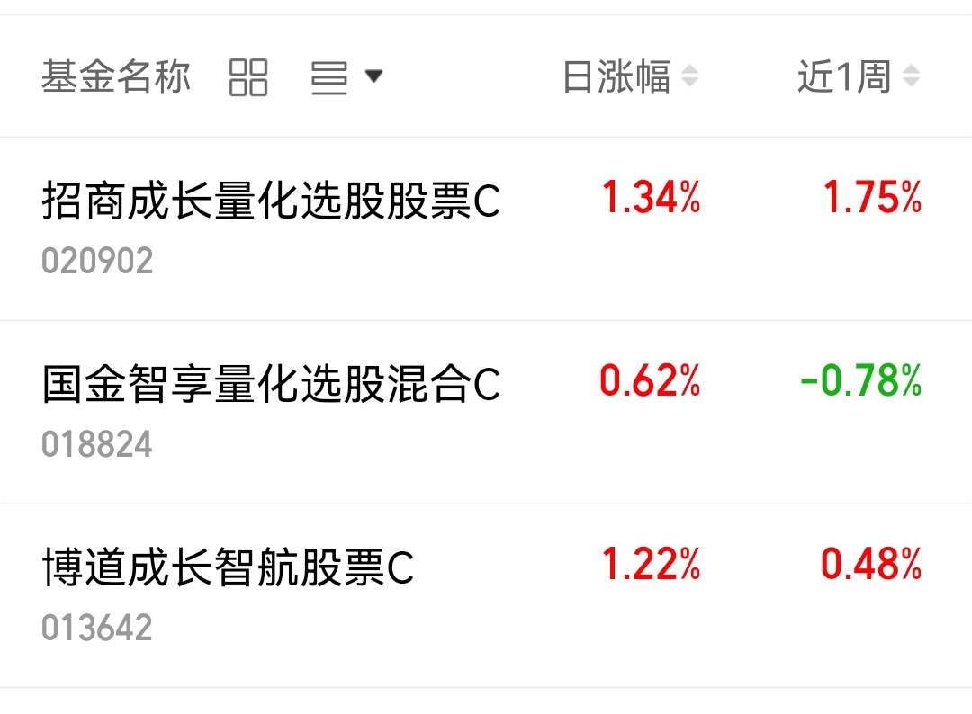 今日大盘行情一路稳定上涨,个股也是全面飘红,涨幅高达3200家,同时在近期的上涨行情中,量化基金也表现出色,来看近一周的具体涨幅情况: